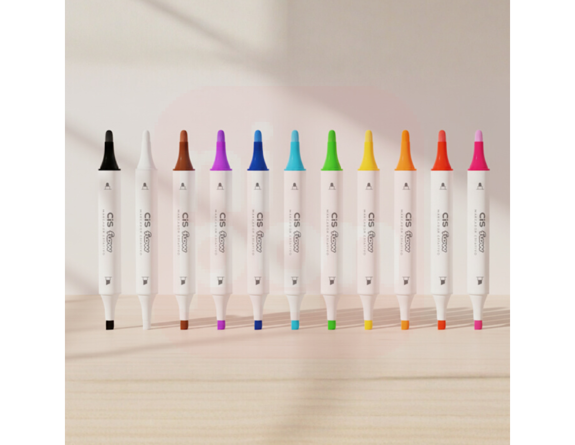 2. Marcador Criativo CIS Flow 12 Cores – Estojo Maleta - Ponta Dupla