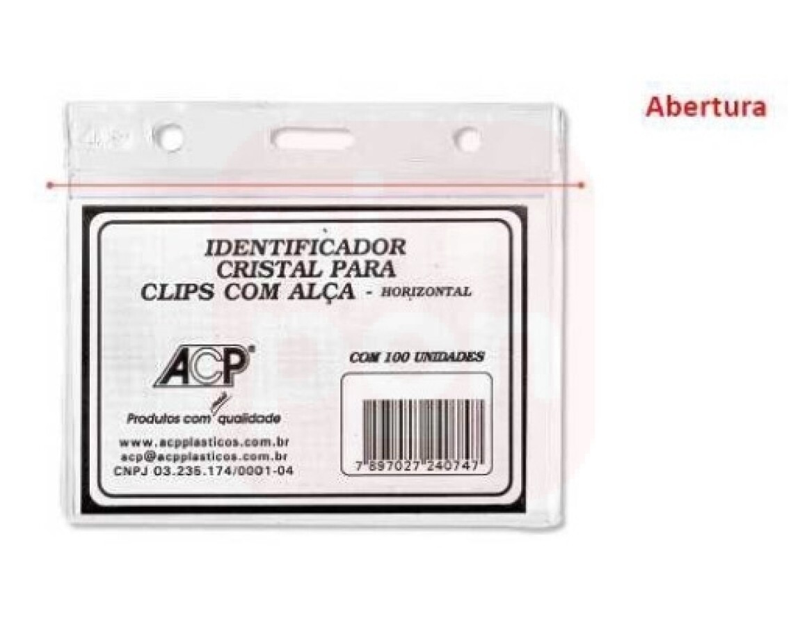 Crachá Identificador Horizontal Tamanho: 70 mm x 100 mm Abertura horizontal Presilha